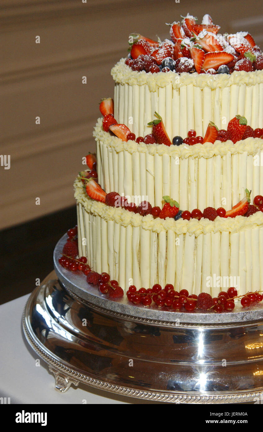 Wedding Cake On Silver Stand With White Chocolate And Fruit Stock