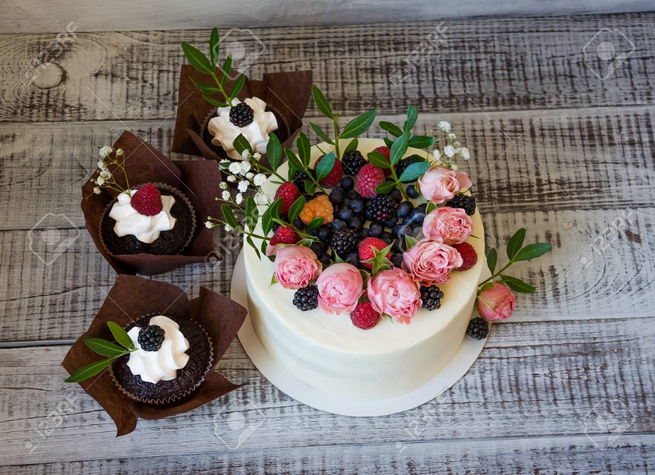 A Cream Cheese Wedding Cake With Cupcakes Decorated With Berries