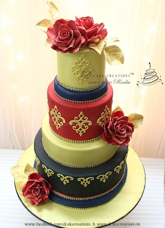 Red Gold Wedding Cake With Royal Blue Flowers Cakecentral Com