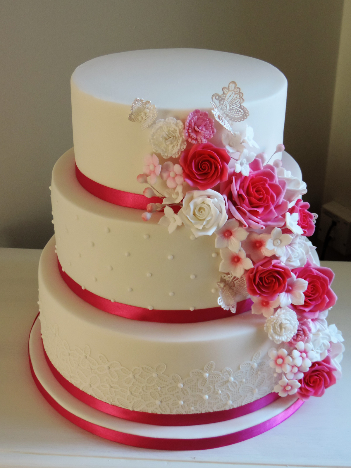 White Wedding Cake With Hot Pink And Red Roses Pink White