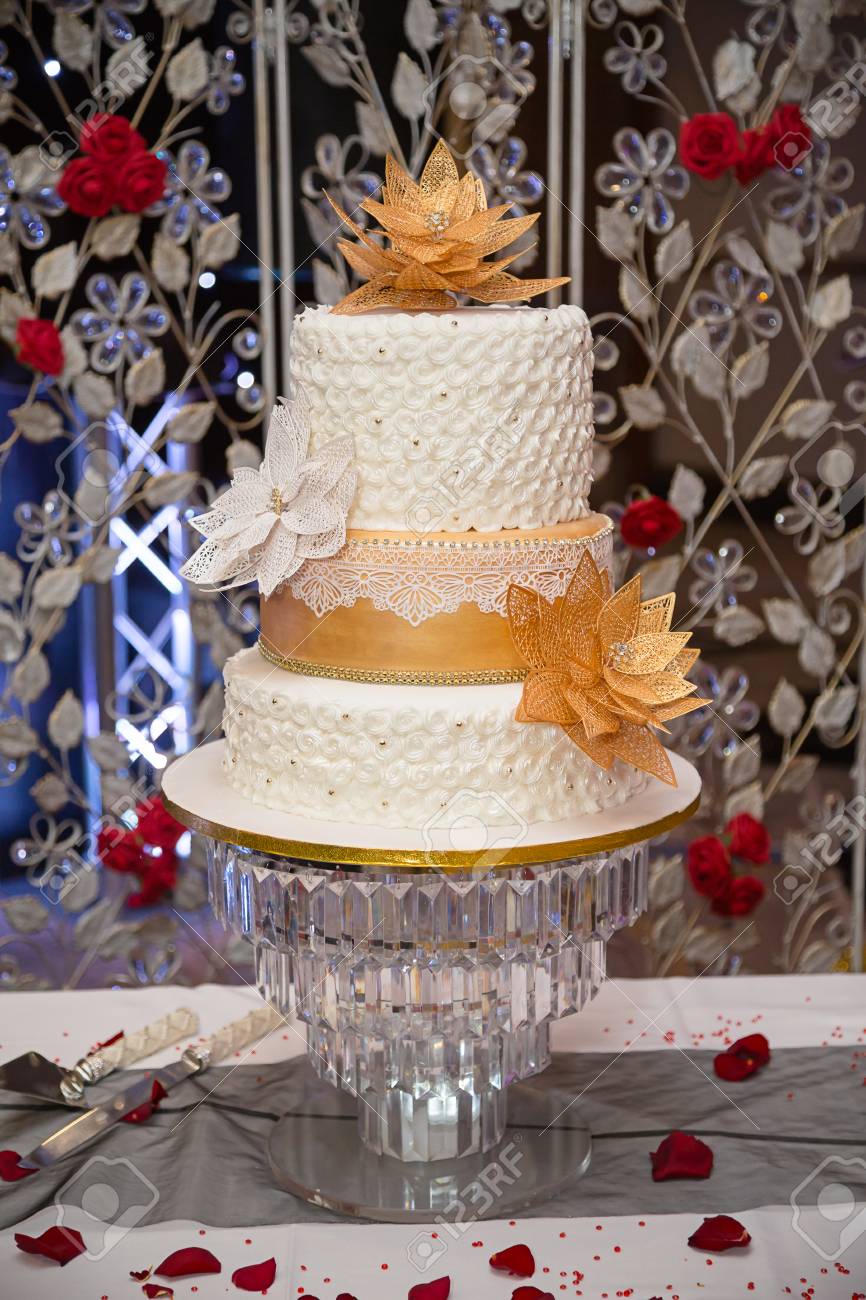Gold Leaf Wedding Cake On Display Stock Photo Picture And Royalty